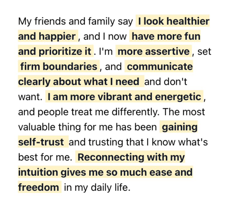 And not just temporarily or when you 'stick to the protocol'; a sustained psycho-spiritial-physiological transformation anchored in an unshakeable connection to your body, your intuition and your peace.