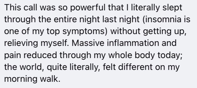 2.) As soon as you join, you'll plug into the Mastermind and get instant access to the entire Embodied Symptom Wisdom Curriculum, integration kits, and every nuance of hearing your symptoms laid out and walked through for you- that will sharpen your capacity to translate pain and let go of the baggage from your past - allowing your healing to happen like clockwork. Then when you come to our coaching sessions live, you're literally just one, tiny tweak away from I HEAR IT NOW. And watching each other rebirth, in real time, is so f*cking fun.
